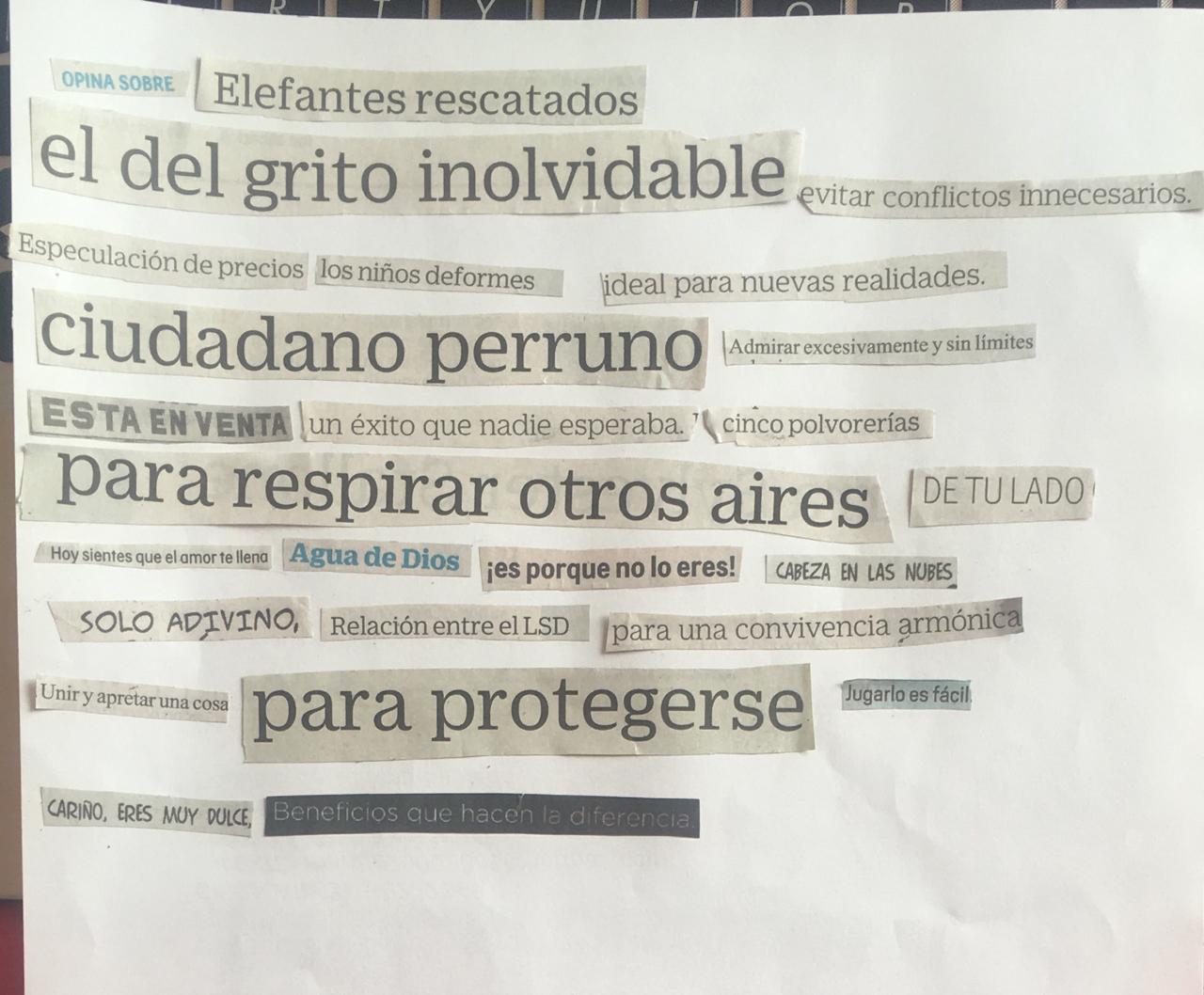 Encontramos en la presente entrega una exploración del taller que se ha dado en referencia al movimiento de vanguardia denominado Dadaísmo de comienzos del siglo XX. Aquí yace el azar, el indeterminismo o esa libre jugarreta que tiene intrínseca el lenguaje. Basta buscar una revista, recortar sus frases, palabras, letras... y luego meterlas en una bolsa, para que las infinitas variables del universo dispongan la forma de esta expresión de la poesía visual.
